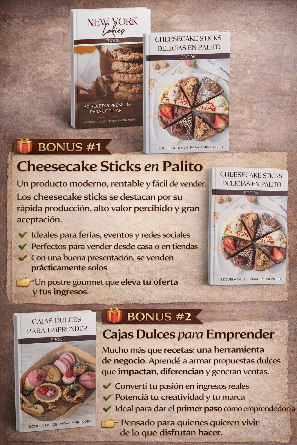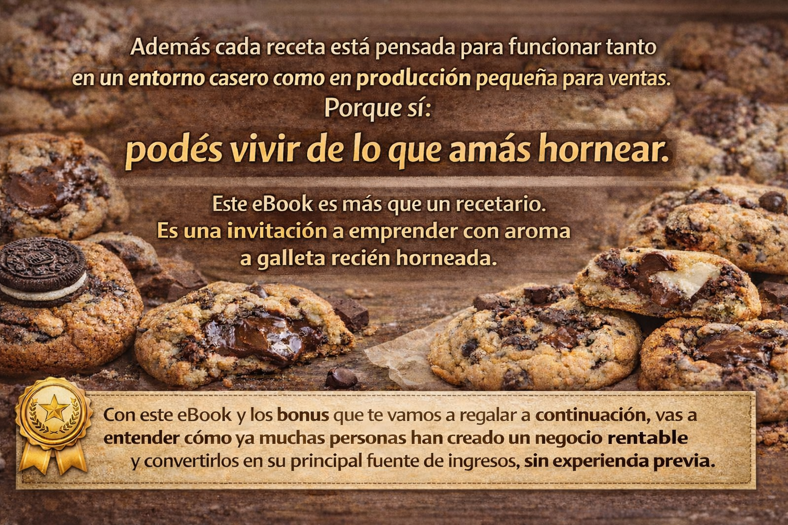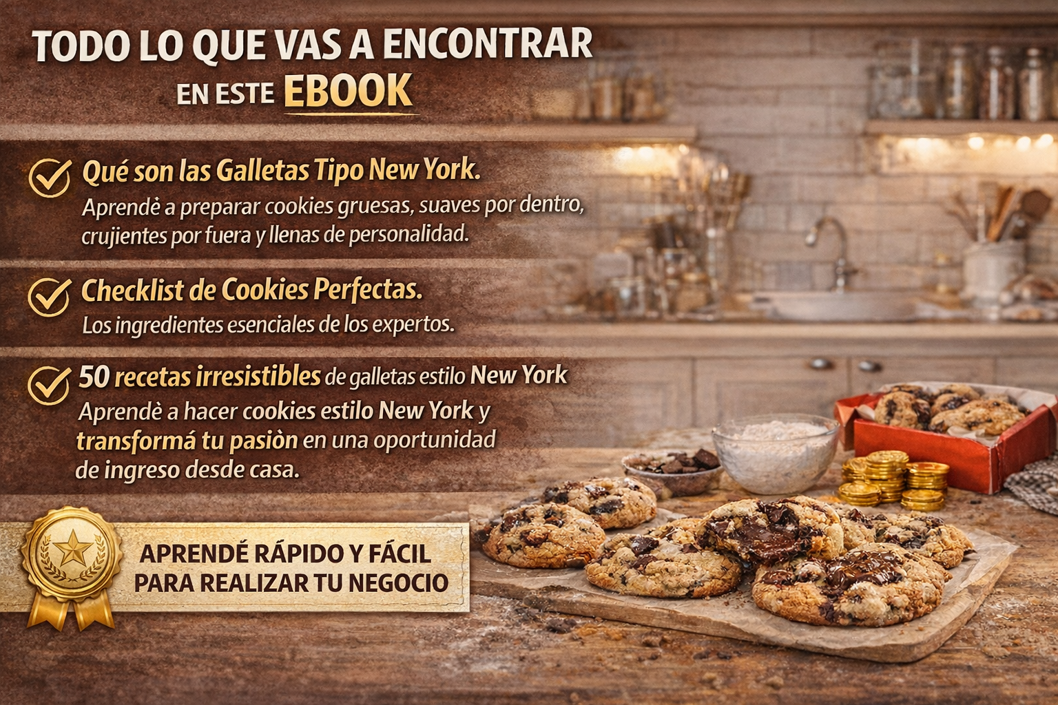 No. Este eBook es un sistema completo que combina recetas probadas con una mirada emprendedora. Aprendés a hacer cookies estilo New York y, además, a transformarlas en un negocio real, ya sea para vender desde casa, generar ingresos extra o ampliar una propuesta existente.